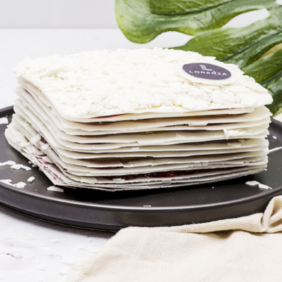 Láminas de chocolate blanco rellenas con manjar artesanal y frambuesa