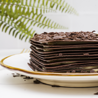 Láminas de chocolate semi amargo rellenas con manjar artesanal y frambuesa