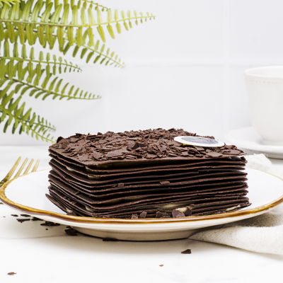 Láminas de chocolate semi amargo rellenas con manjar artesanal y frambuesa