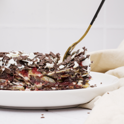 Láminas de chocolate semi amargo y blanco rellenas con manjar artesanal y frambuesa