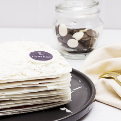 Láminas de chocolate blanco rellenas con manjar artesanal y frambuesa