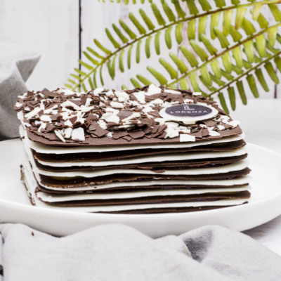 Láminas de chocolate semi amargo y blanco rellenas con manjar artesanal
